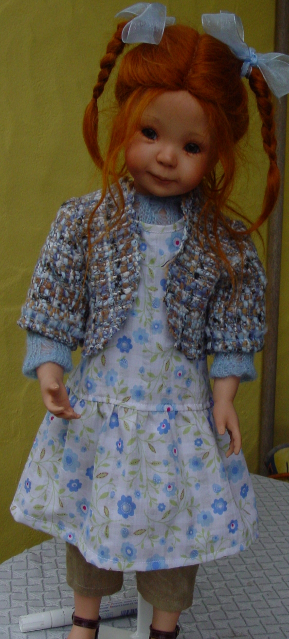 Das Bastelset besteht aus einer Leinenhose, Kleidchen aus zart bedruckter Baumwolle, Pulli und Tweedjacke. Im Bastelset sind die Zugeschnittenen Stoffteile, eine Nähanleitung und Knöpfe enthalten.